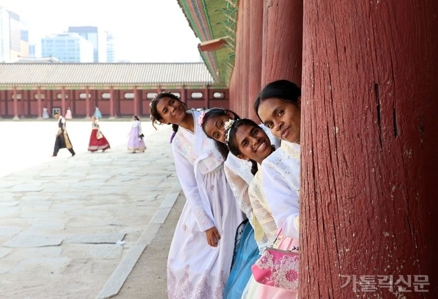 ๋ํฐ๋ชจ๋ฅด ๊ฐ๋ฅด๋ฉ ์ฑ๋ชจ ๊ณ ๋ฑํ๊ต ํ์๋ค์ด 7์ 24์ผ ์์ธ ๊ฒฝ๋ณต๊ถ์ ๋ฐฉ๋ฌธํ์ต๋๋ค. ํ๊ตญ ์๊ต ๋ณต์ ์ฑ์ง ์๋ํ ๋ํฐ๋ชจ๋ฅด ์๊ต ๋ณต์ ์๋์์ด ์ฒ์ ๋ง๋ จํ 'ํ๊ตญ-๋ํฐ๋ชจ๋ฅด ์ฒญ์๋